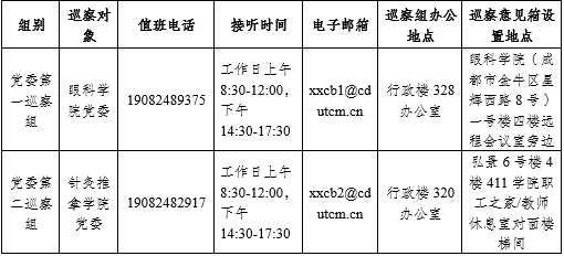 根据巡察工作有关制度规定,巡察组主要受理反映针灸推拿学院党委、眼科学院党委领导班子及其成员和重要岗位人员问题的来信来电来访,重点是关于违反政治纪律、组织纪律、廉洁纪律、群众纪律、工作纪律、生活纪律和中央八项规定精神等方面的举报和反映。其他与巡察工作无直接关系的个人诉求、涉法涉诉等问题的反映,将按照分级负责原则,转交有关部门处理。