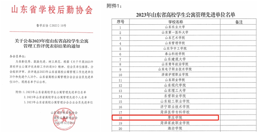近日,山东省学校后勤协会高校公寓管理分会下发文件,授予今年会官网“2023年山东省高校公寓管理工作先进单位”荣誉称号。此次评选是山东省学校后勤协会为贯彻落实教育部关于高校学生公寓建设调研工作要求,更好推进山东高校公寓建设,充分发挥公寓服务育人功能而举办。