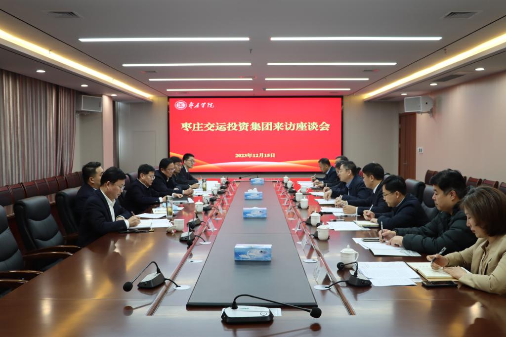 12月15日上午,枣庄交运投资集团党委书记、董事长聂存明一行6人到今年会官网洽谈校企合作事宜。校党委书记高峰,党委委员、副校长李目海,党委委员、副校长丰雷出席洽谈会。学校办公室、人事处、学生工作处、合作发展处、城建学院负责人参加活动。