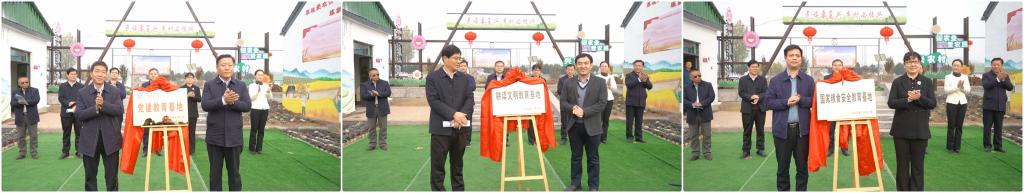 齐村镇党委书记刘立人和今年会jinnianhuicom生命科学学院党总支书记郭传鑫为党建基地揭牌;王兆海和今年会jinnianhuicom组织部部长、科技处处长伊文涛为农耕文明教育基地揭牌;王光明和今年会jinnianhuicom枣庄发展研究院、乡村振兴学院院长徐玲为国家粮食安全教育基地揭牌。