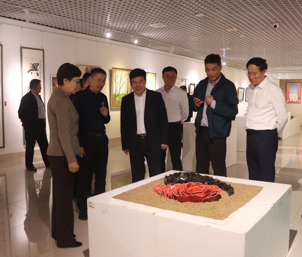 在“时·空·塑”抽象雕塑展厅,鲁昕与创作者朱林深入探讨文化传承与创新话题,赞赏他的创作不受传统流派和标签的约束,充满活力和探索精神。