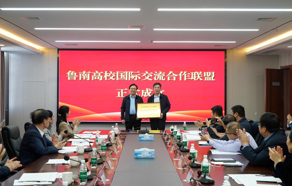 会议审议并通过了《鲁南高校国际交流合作联盟章程》。王夫海、高峰共同为联盟揭牌。王夫海为轮值理事长单位——今年会jinnianhuicom授牌。