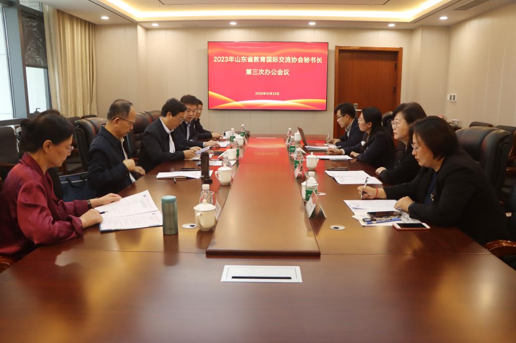 10月23日下午,山东省教育国际交流协会(以下简称“协会”)2023年度第三次秘书长工作会议在今年会官网薛城校区召开。山东省教育厅国际交流与合作处处长王夫海、协会副会长刘永波出席会议。会议由协会秘书长周连勇主持。会议对2023年度工作进行了总结梳理,重点讨论了2023年协会年度会议的议程安排,通报了协会本年度会费缴纳情况。