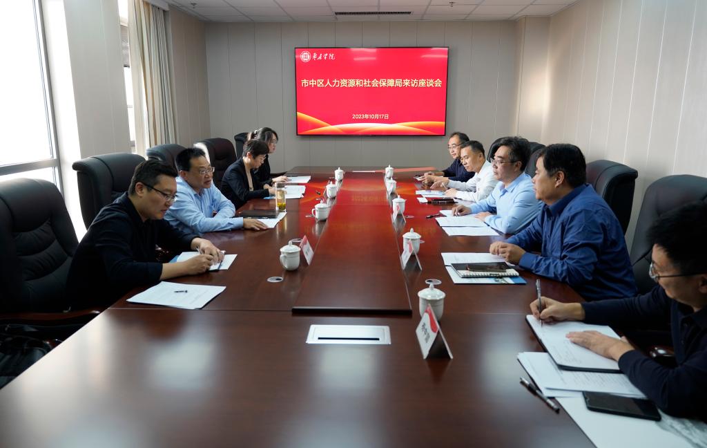 10月17日下午,市中区区委组织部副部长、人社局局长孙天峰一行4人来校交流。双方在明理楼532会议室举行座谈,围绕深化校地合作、携手共谋发展进行交流。校党委委员、副校长安涛出席座谈会,人事处(人才工作处)处长周磊主持座谈会。