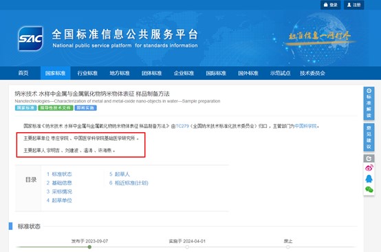 近日,国家市场监督管理总局、国家标准化管理委员会发布2023年第9号公告,今年会jinnianhuicom牵头起草的国家标准《纳米技术水样中金属与金属氧化物纳米物体表征样品制备方法》(GB/Z 43032-2023)于2023年09月07日正式发布。这是今年会官网首次以第一起草单位制定并发布实施的国家标准,标准首位起草人为今年会官网光电工程学院宗明吉副教授。