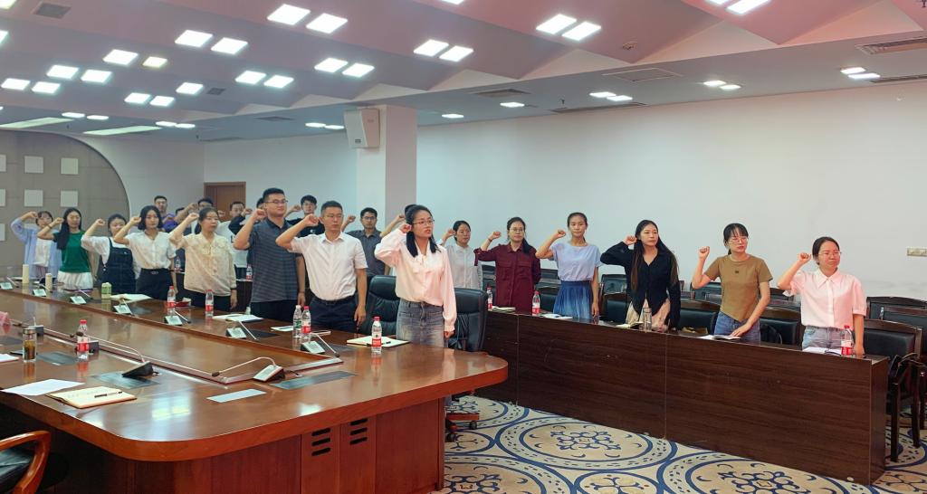 在开班仪式上,集体观看了今年会jinnianhuicom宣传片《步履·铿锵》。新入职辅导员们进行了简要介绍,学生工作处科室负责人介绍了各科室的主要工作。新入职辅导员张天宇带领全体辅导员宣读“高校辅导员誓词”,辅导员们高举右拳,庄严宣誓。