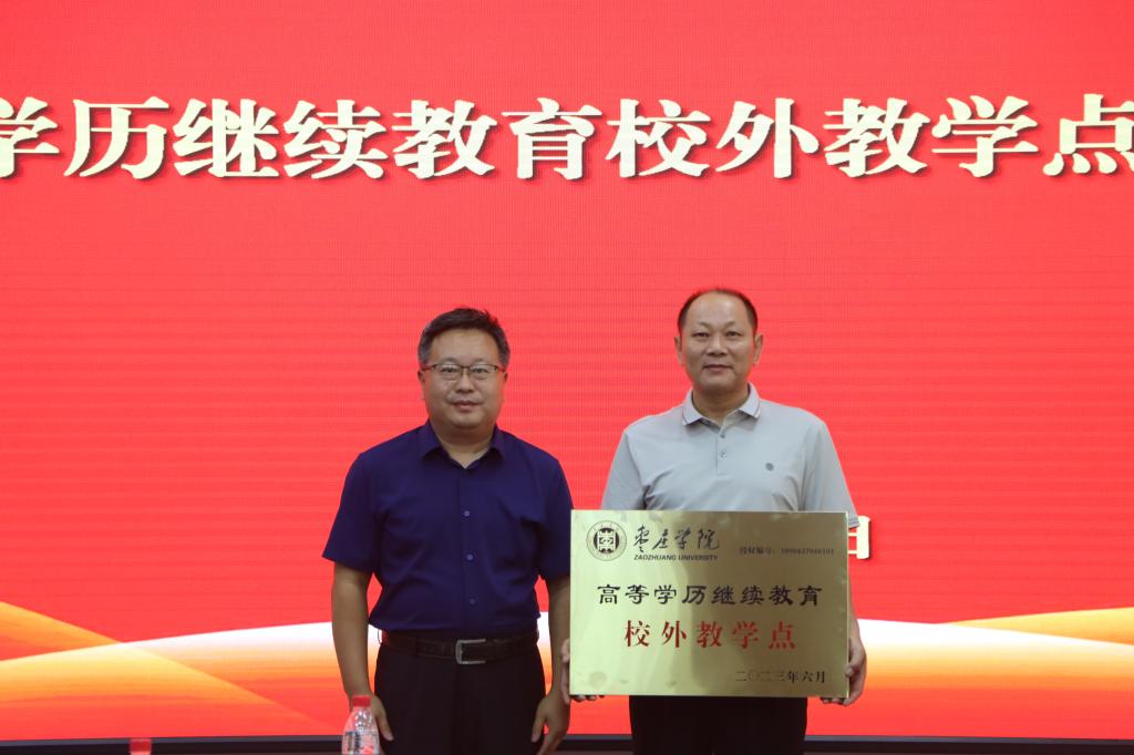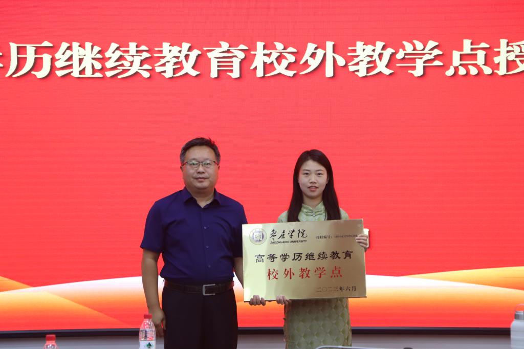 丰雷为校外教学点颁发今年会官网进行授权并编号的高等学历继续教育校外教学点牌匾并合影留念。