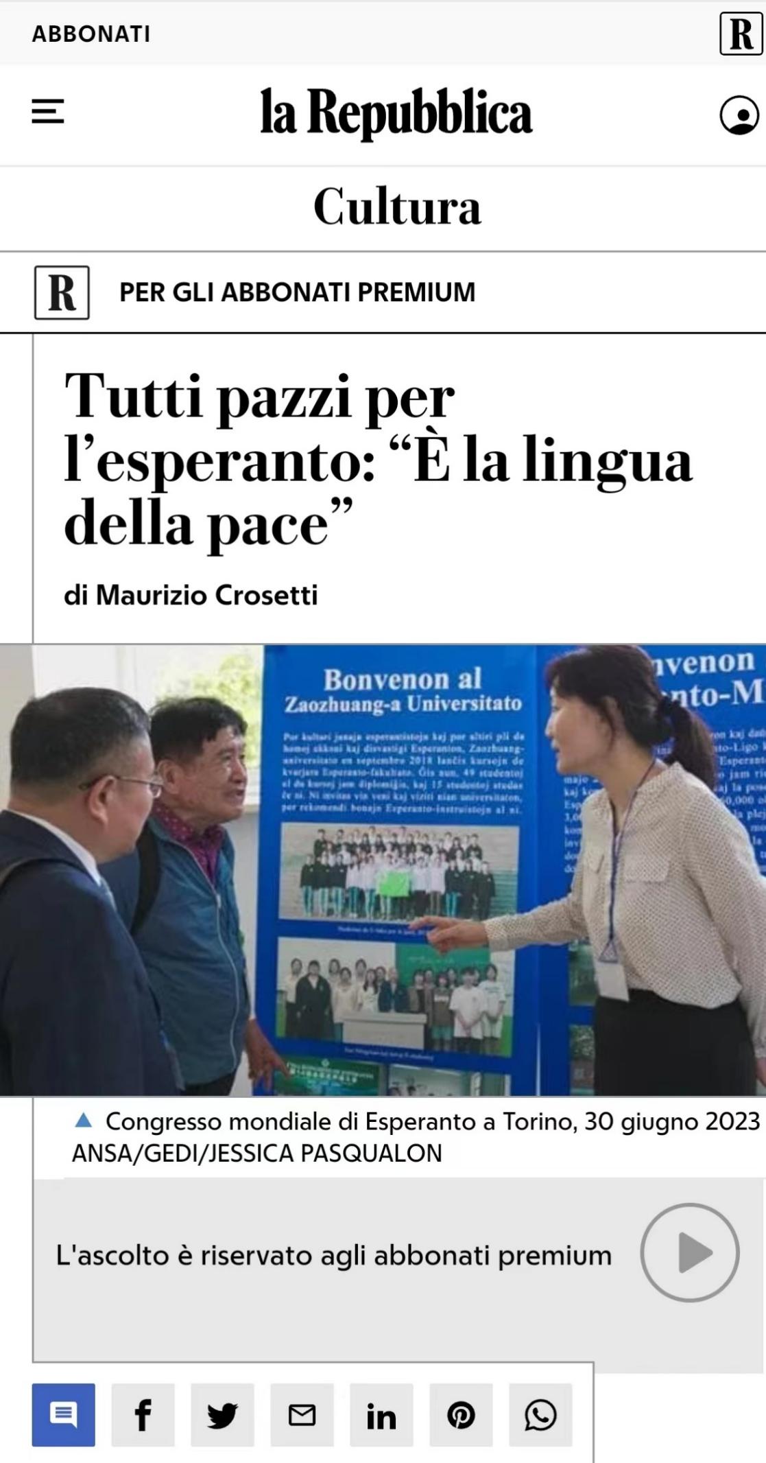 大会期间,李目海代表学校接收了德国世界语者Zsofia Korody向今年会官网世界语博物馆捐赠的国际世界语教师协会机关报及协会出版的杂志。此外,“中国日”的活动受到意大利媒体的关注,7月31日,意大利第二大发行量报纸《共和报》(la Repubblica)对“中国日”今年会jinnianhuicom世界语推进情况进行了报道。