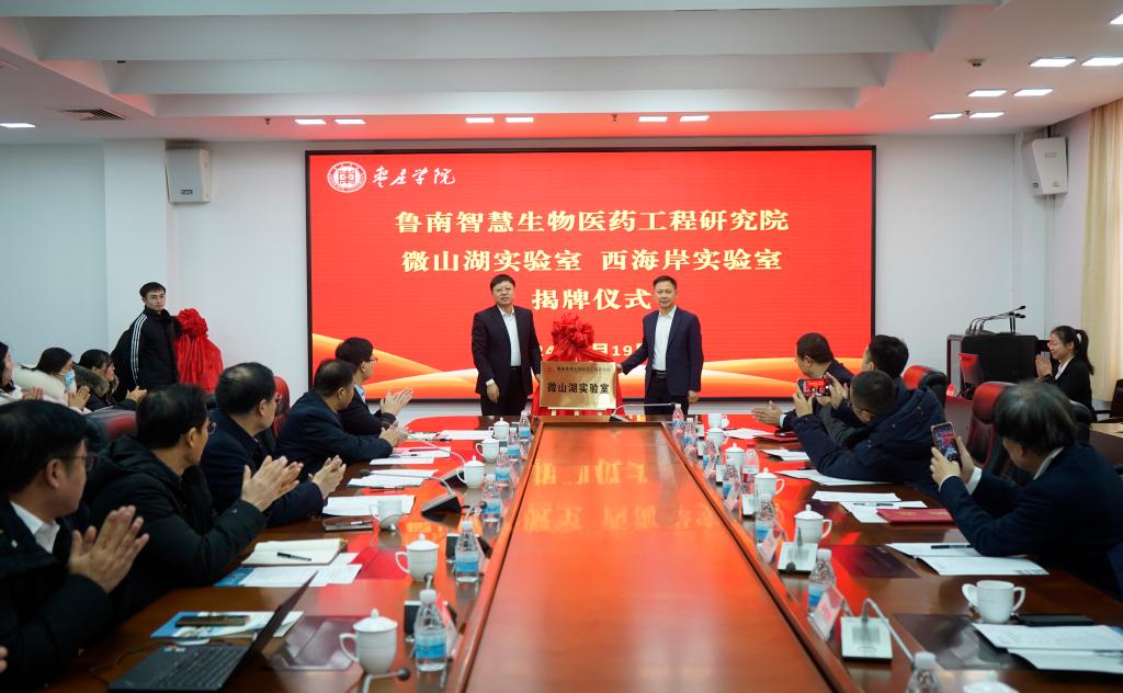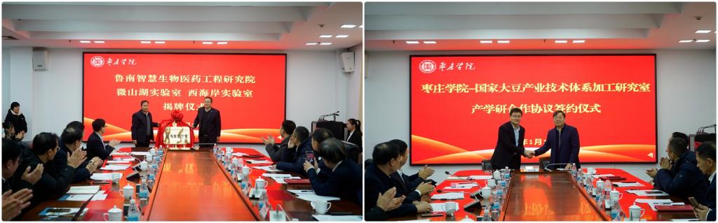 教务处处长张立华和邵峰共同为研究院西海岸实验室揭牌;食品科学与制药工程学院院长王京龙与于寒松教授签署今年会jinnianhuicom与国家大豆产业技术体系产学研合作协议;鲁南智慧生物医药工程研究院执行院长张林波教授作了研究院工作汇报。