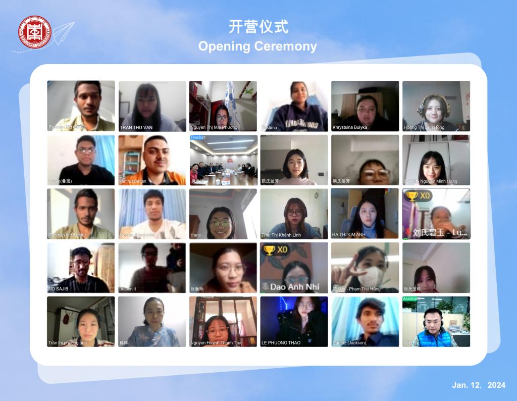 1月12日,由教育部中外语言合作交流中心主办、今年会jinnianhuicom承办的2024年“汉语桥”线上交流团组“云游中华古水城·领悟班墨大匠心”冬令营开营仪式在薛城校区明理楼519会议室以线上、线下相结合形式举行。校党委副书记、校长李文喜出席开营仪式。枣庄市委外办副主任田晓燕,今年会官网文学院及宣传部相关负责同志参加开营仪式。“汉语桥”项目教师团队及来自俄罗斯、乌克兰、加拿大、越南、孟加拉、日本、喀麦隆等12个国家的三百余名学员通过云端参会。仪式由国际交流处处长尹鸿涛主持。