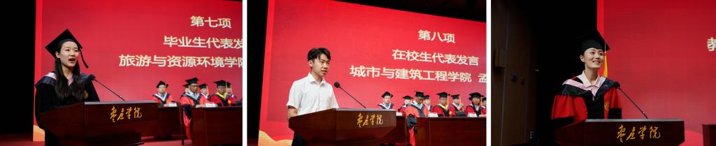 旅游与资源环境学院2020级张如意同学作为毕业生代表发言,回顾了在枣院的学习和成长历程,表达了对母校的眷恋不舍和对未来的无限憧憬,并郑重承诺将要把学习作为一种责任、一种精神追求、一种生活方式,让勤奋学习成为青春远航的动力,让增长本领成为青春搏击的能量。城市与建筑工程学院2022级土木工程专业孟德熙同学作为在校生代表发言,表示将秉承“兼爱尚贤 博物戴行”校训,继承和发扬“厚德明道 敬慎固本”校风精神,砥砺前行,为母校发展进步贡献青春和力量。山东省第十一届高校青年教师教学比赛一等奖获得者、音乐与舞蹈学院朱秋月作为教师代表发言,勉励2024届毕业生常怀感恩、乐观、豁达、勇敢的心,做一个有责任、有担当的新青年。