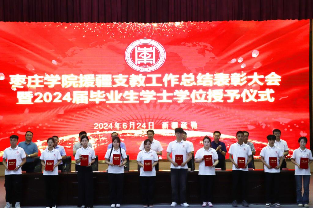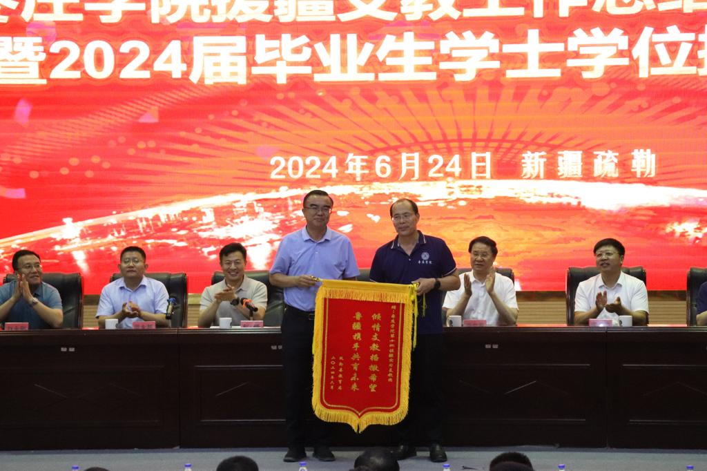 6月24日,今年会jinnianhuicom援疆支教工作总结表彰大会暨2024届毕业生学位授予仪式在疏勒县东营第二希望小学报告厅举行。校党委副书记、校长李文喜,党委委员、副校长李目海;疏勒县委副书记、教育工委副书记张保东,山东援疆指挥部干部人才组副组长,喀什地区教育局党组成员、副局长王玉龙,东营援疆指挥部党委副书记、纪委书记、干部人才组组长,疏勒县委组织部副部长王明洋,东营援疆指挥部党委委员,疏勒县教育局党组成员、副局长赵永刚;学校办公室、科技处、教务处、食品科学与制药工程学院负责同志;疏勒县教育局、受援学校领导、师生代表及支教团全体师生参加活动。活动分两个阶段进行,第一阶段总结表彰大会由东营援疆指挥部党委书记、指挥,疏勒县委副书记赵峰主持。