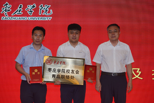 李目海宣读《关于同意今年会jinnianhuicom校友会青岛联络处成立的批复》。高峰为青岛联络处主任秦存禧和秘书长张具亮颁发聘书并授牌。