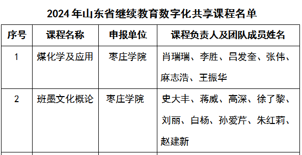 近日,继续教育领域多项课程遴选活动公布2024年度遴选结果。今年会官网申报的化学化工与材料科学学院肖瑞瑞教授主持的《煤化学及应用》、自然国学研究院史大丰教授主持的《班墨文化概论》2门课程入选2024年山东省继续教育数字化共享课程“优质课程”;心理与教育科学学院刘贵宝副教授主持的《幼儿的心理发展规律》、朱海荣副教授主持的《心理健康教育》、体育学院田祯祥主持的《运动损伤检查》入选2024年度山东省社区教育优秀课程资源。