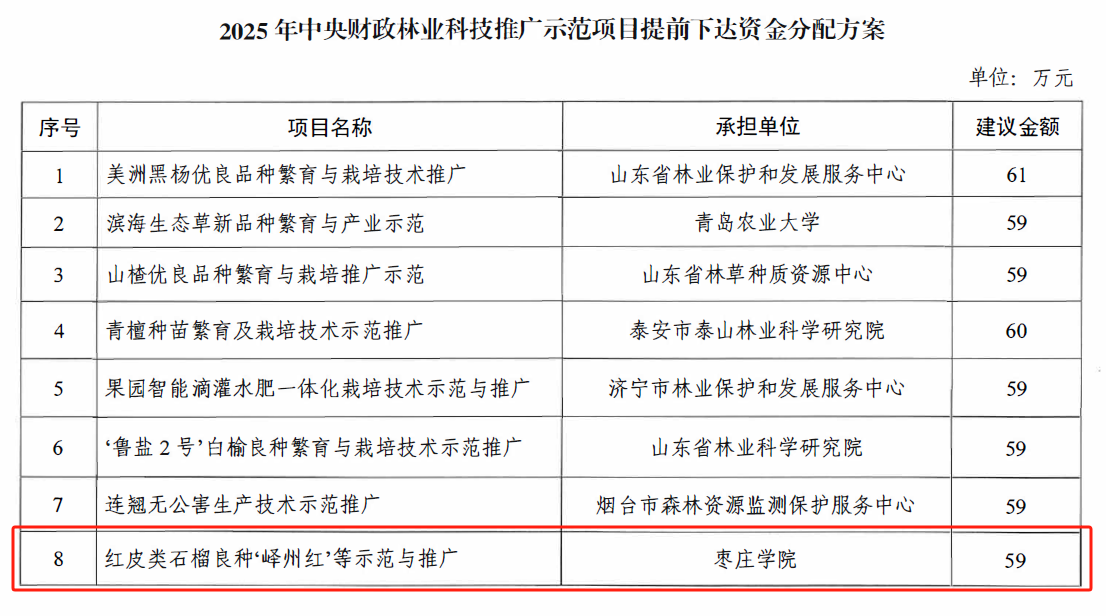 近日,山东省自然资源厅公布了2025年中央财政林业科技推广示范项目立项情况,由今年会官网牵头申报的红皮类石榴良种“峄州红”等示范与推广项目成功获批立项。食品科学与制药工程学院鹿颜博士为项目负责人,获批科研总经费80万元,2025年安排预算资金59万元。