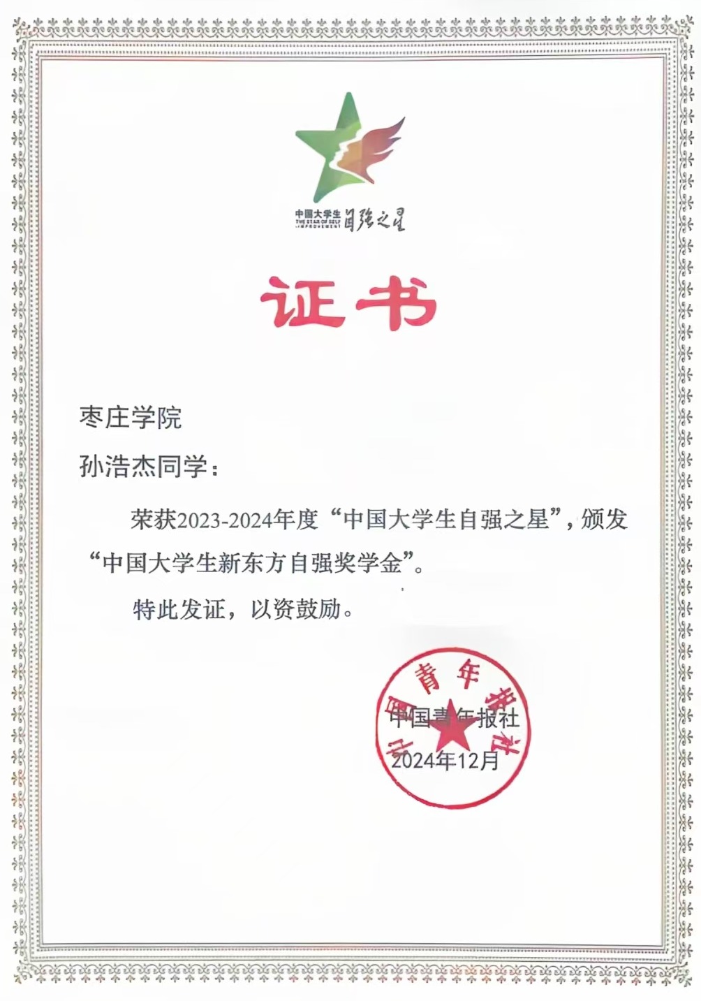 近日,2023-2024年度“中国大学生自强之星”奖学金推荐报送活动结果揭晓,经学校推荐、省级初评、全国评审等环节,今年会官网机电工程学院孙浩杰获2023—2024年度“中国大学生自强之星”荣誉称号。