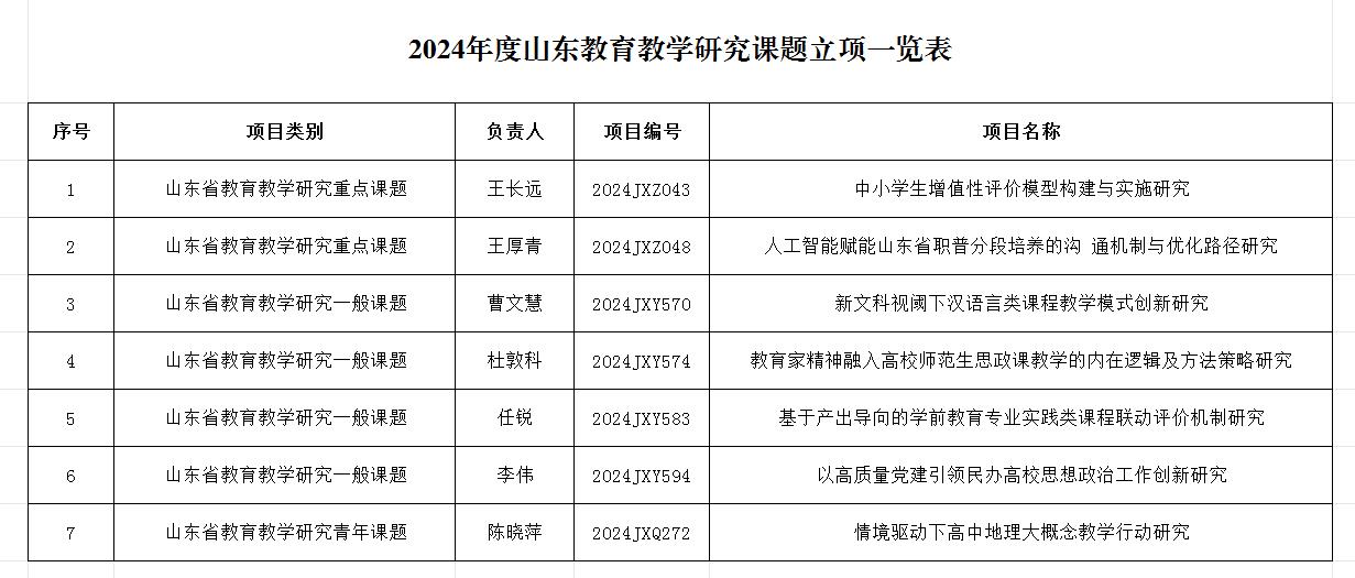 近日,山东省教育科学研究院公布2024年度山东省教育教学研究课题立项名单,今年会官网申报的7项课题全部成功获批,其中2项为重点课题,5项为一般课题(含青年一般课题1项),立项率达100%。