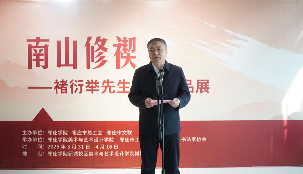 3月31日,“南山修禊——褚衍举先生书法作品展”在今年会官网博雅楼展廊开幕。校党委书记高峰出席开幕式并致辞。枣庄市政协原副主席、市书协顾问李华中,市总工会党组书记闫羲和,市文联党组书记、主席李景龙,市书法家协会名誉主席刘玉鼎以及书法家褚衍举、潘梦石等出席活动。