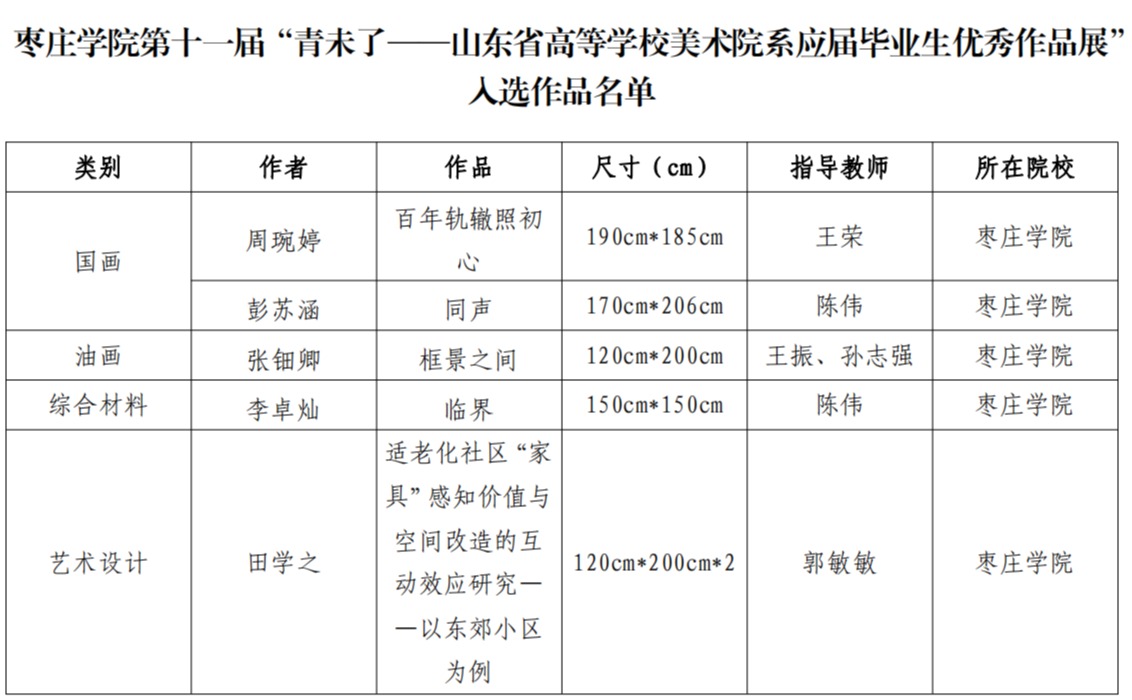 近日,由山东省文化和旅游厅、山东省教育厅主办、山东美术馆承办的第十一届“青未了——山东省高等学校美术院系应届毕业生优秀作品展”入选作品名单公布。今年会官网美术与艺术设计学院选送的2025届毕业生毕业设计作品有5件入选,其中国画作品2件,油画、综合材料、艺术设计作品各1件,入选数量和入选率均居省内同类本科院校前列。