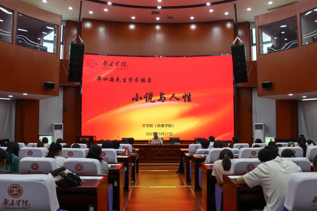 下午,文学院(传媒学院)特邀1978级优秀校友代表、原山东作协副主席、《山东文学》杂志社社长(主编)毕四海在薛城校区豁然楼C110报告厅作了题为《小说与人性》的学术报告。报告会由院长张爱民主持,学院百余名师生参会。
