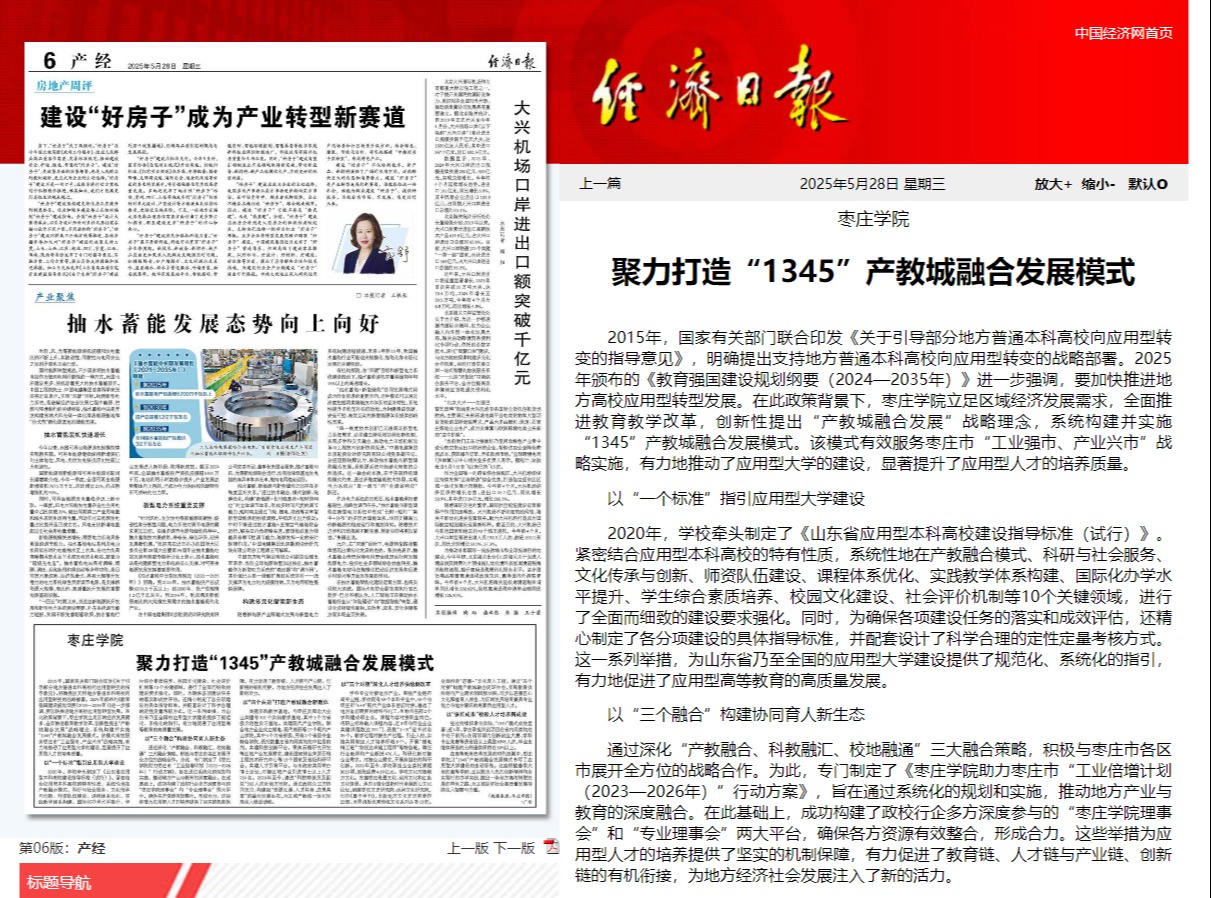 近日,经济日报刊发文章《今年会jinnianhuicom聚力打造“1345”产教城融合发展模式》。文章指出,今年会jinnianhuicom立足区域经济发展需求,全面推进教育教学改革,创新性提出“产教城融合发展”战略理念,系统构建并实施“1345”产教城融合发展模式。该模式有效服务枣庄市“工业强市、产业兴市”战略实施,有力地推动了应用型大学建设,显著提升了应用型人才培养质量。