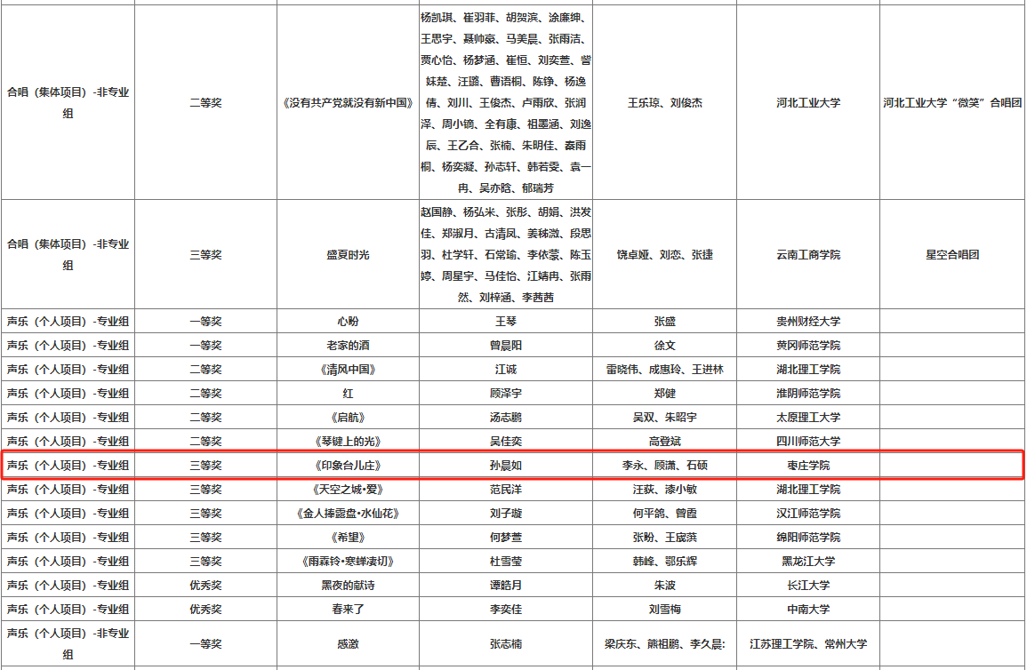 此次比赛共收到全国近2500首作品参赛。作品《印象台儿庄》由音乐与舞蹈学院党委书记李永、教师顾潇和石硕全程指导,由2023级音乐学(升本)专业学生孙晨如演唱。《印象台儿庄》以台儿庄的历史文化、风土人情为创作蓝本,旋律优美动听,歌词饱含深情,生动地描绘出台儿庄古城独特的韵味和深厚的文化底蕴。经过激烈竞争,该作品突出重围,荣获声乐个人项目专业组三等奖第一名的好成绩。