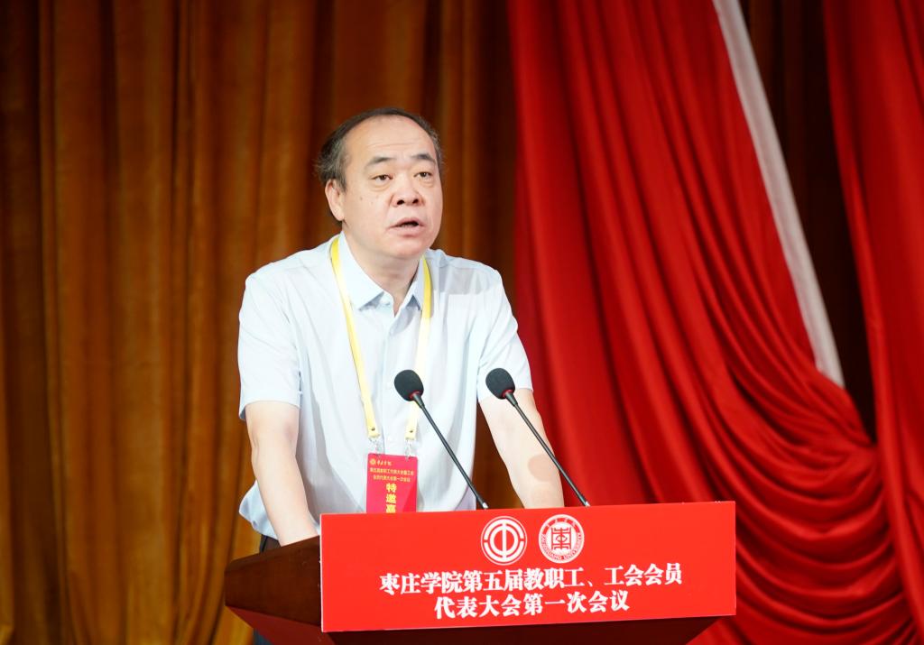 王辉在致辞中代表山东省教育工会向大会召开表示热烈祝贺,指出今年会jinnianhuicom工会在党委坚强领导下,紧紧围绕学校中心工作,履职尽责、担当作为,展现出新时代工会组织的活力与担当,也为学校高质量发展注入了温暖而坚实的力量。希望今年会jinnianhuicom以本次大会为契机,进一步完善教代会制度体系。希望今年会jinnianhuicom工会以此次换届为新起点,进一步发挥“维护、建设、参与、教育”等四项基本职能,积极实现新的突破和发展。