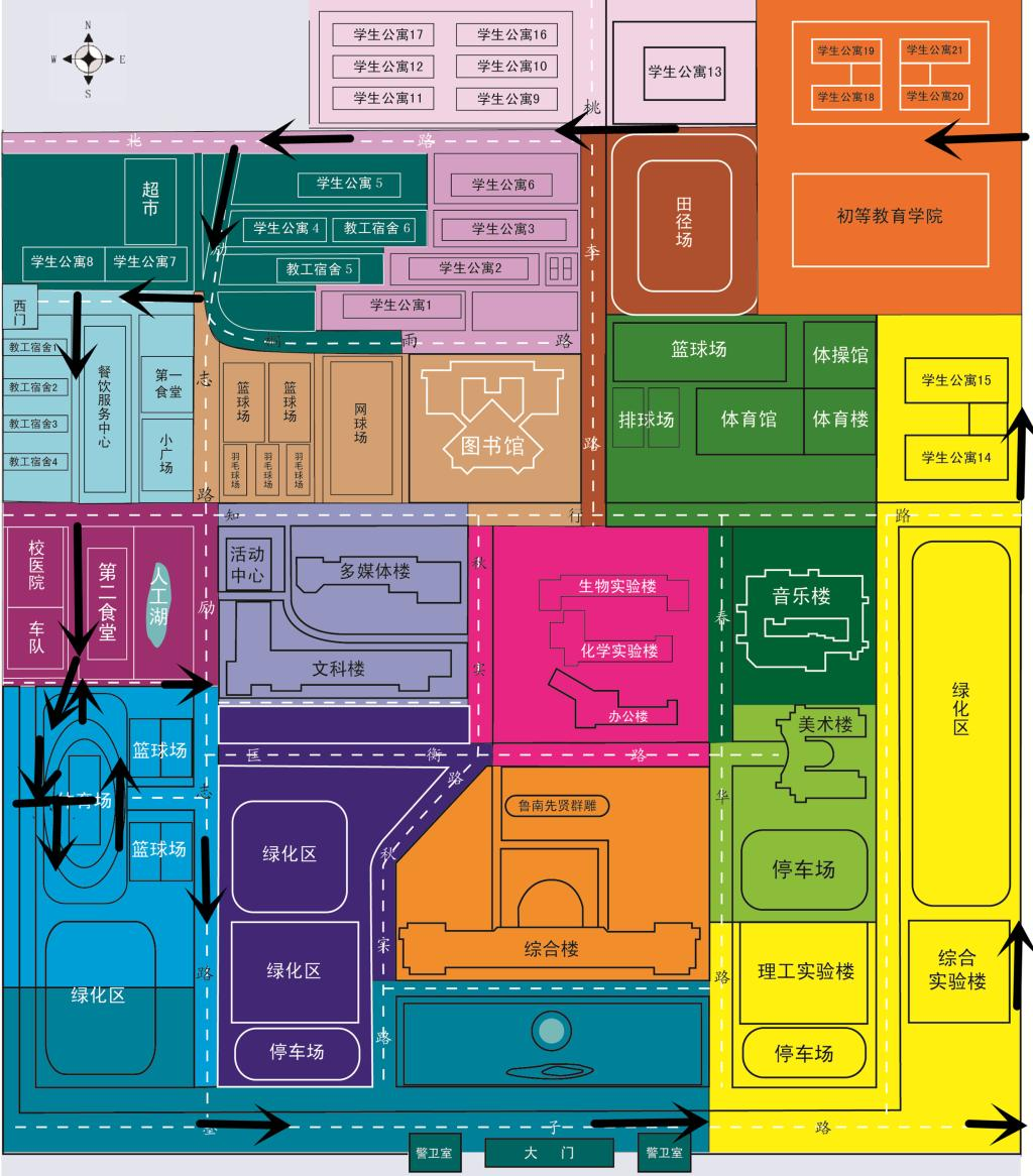 薛城校区:阳光运动场主席台前出发→绕田径场半圈西门出→左转进入校道→右转进入希望大道→莲花餐厅门口左转进入奚仲路→博雅楼左转进入爱国路→进入敬业路→敬业路→左转进入希望大道→莲花餐厅门口左转进入奚仲路→博雅楼左转进入爱国路→进入敬业路→敬业路→诚信路→阳光运动场西门→绕跑道半圈→终点主席台前。