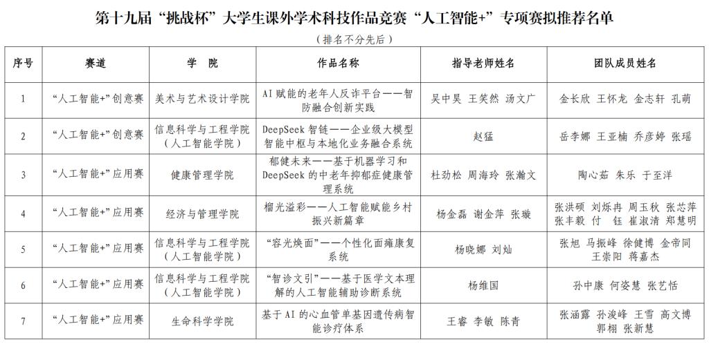根据《挑战杯全国大学生课外学术科技作品竞赛“人工智能+”专项赛方案》要求,经严格审核,拟推荐以下2项作品参加第十九届“挑战杯”全国大学生课外学术科技作品竞赛“人工智能+”专项赛创意赛,8项作品参加第十九届“挑战杯”全国大学生课外学术科技竞赛“人工智能+”专项赛应用赛,现予以公示。
