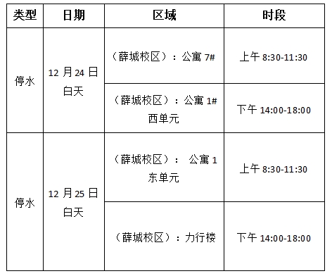 为提升水电管理水平,学校计划为市中校区和薛城校区安装智能水电表。目前该项目已完成招标、采购,现进入安装阶段。为将停水停电对教育教学、办公等活动的影响降到最低限度施工将分区域分时段进行。从11月28日起,后勤服务处将每天公布当日停水停电的具体区域和时段。请涉及的相关单位做好准备,提前通知到每位教职工,确保人员和设备安全,例如服务器、计算机、实验设备等做好备份,电梯和其它特种设备做好提前应对和管理。当日停水停电具体区域详见附件(每日更新,提前1天发布)。特殊情况联系电话15866247658。