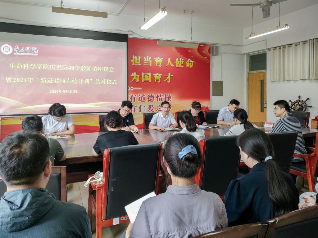为提高青年教师的教育教学水平,助力青年教师更快更好地成长,发挥骨干教师的示范、引领作用,9月10日,在第四十个教师节来临之际,生命科学学院在理工楼2220会议室举行庆祝第40个教师节座谈会暨2024年“新进教师青蓝计划”结对仪式。学院党政领导、结对教师及部分学生参加。