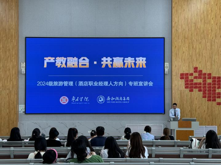 为进一步深化产教融合、校企合作,深入推进校企双主体育人实践,创新工学结合、知行合一的人才培养模式改革, 9月19日上午,旅游与资源环境学院和山东舜和酒店集团有限公司在薛城校区增信楼举办旅游管理(酒店职业经理人方向)班宣讲活动。山东舜和酒店集团副总裁白璐、行政人资执行总监李林、人才开发部经理刘康主讲,2024级旅游管理专科专业新生及家长参加。