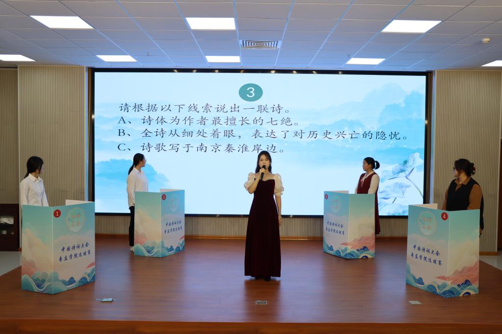 比赛分诗词飞花令、一对一问答和计时抢答三个环节。诗词飞花令环节主要考察诗词储备与临场思维应变能力,比赛中选手们沉着冷静,妙语连珠,尽显扎实的诗词功底。一对一问答环节考察选手们的诗词知识及语言表达能力,他们对答如流,思维敏捷,现场气氛热烈而妙趣横生。计时抢答环节考察选手们的创新思维和信息处理能力,参赛选手在台上摩拳擦掌,自信满满,充分展示了学子们昂扬向上的精神面貌和渊博的知识。