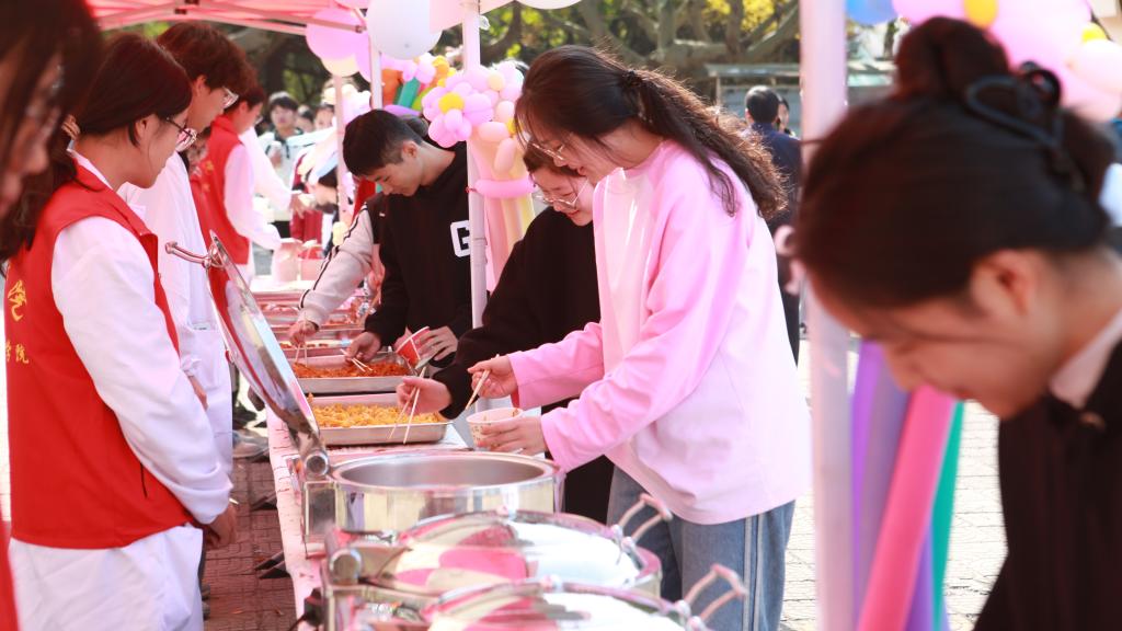 活动现场人头攒动,热闹非凡。在品尝区,新鲜出炉的红薯香气四溢,软糯香甜的金黄薯肉热气腾腾,让人垂涎欲滴。摊位前,前来品尝的师生们络绎不绝,各种红薯美食凭借绝佳的口感和独特的魅力,受到广大师生的广泛好评和大庆赞誉;在展销区,包括哈密冰糖薯、济薯26、西瓜红蜜薯、榴莲蜜薯、烟薯25等一筐筐新鲜出土的红薯以其饱满的外形、鲜艳的色泽吸引着众人的目光。参与者纷纷选购,希望将冬季的第一份甜蜜和温暖积极与朋友及家人分享。