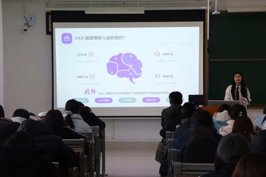 在报告中,张喆以“AIGC到底是什么”开始,从AIGC初体验,到AIGC能做哪些方面的创作、大模型为AIGC发展带来可能、AIGC发展方向及其应用等,进行了深入细致的阐释与演示,让文学院师生详细了解了ChatGPT、OpenAI发展历程、国内模型及职业替代计算模型等,对AI助力学习工作实践、“AI取代人”已经走进现实有了深刻的体验与感受。