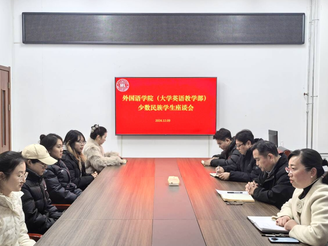 为深入学习贯彻党的二十大精神,铸牢中华民族共同体意识,进一步关心少数民族学生的学习和生活情况,12月9日,外国语学院(大学英语教学部)在豁然楼A102会议室召开少数民族学生座谈会。学院党政领导、专职辅导员和少数民族学生代表参加此次座谈。