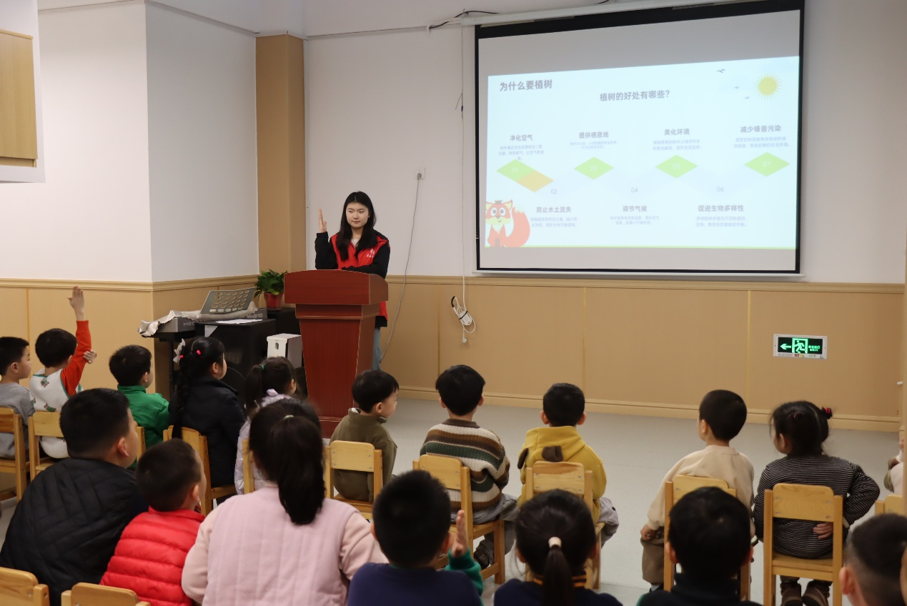 在植树现场,身穿红马甲的志愿者“大朋友”们与活泼可爱的小朋友们,一起培土、浇水,共同栽下一棵棵爱心树。在同学们的帮助下,孩子们把一片片写有“爱心树”“友谊林”“绿宝贝”心愿卡系在树枝上。崭新的树苗轻轻摇曳,沾着泥点的小脸上绽放着童真。在教室里,同学们通过精心准备的PPT,向小朋友们讲解植树节的由来,讲述树木森林创造宜居生态环境的重要意义,分享人与自然和谐共处的故事。小朋友们认真聆听,踊跃发言,欢声笑语不断。