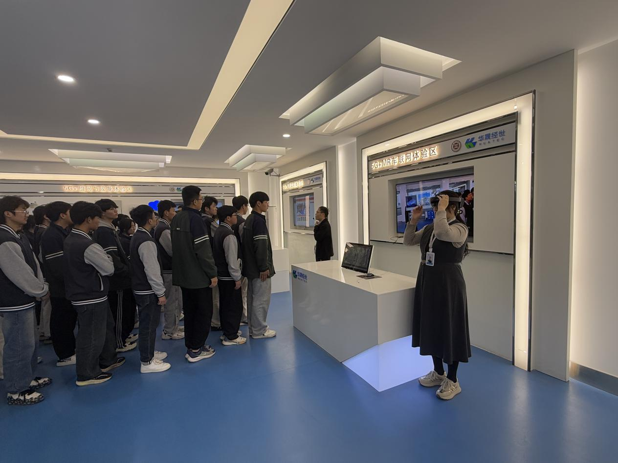 座谈会后,山亭区职业中专师生参观了教育部 ICT 产教融合创新基地、VR 虚拟现实实验室和人工智能实训室。学生们亲身体验了 5G + 无人机配送、MR 车联网、人形机器人的编程与应用。