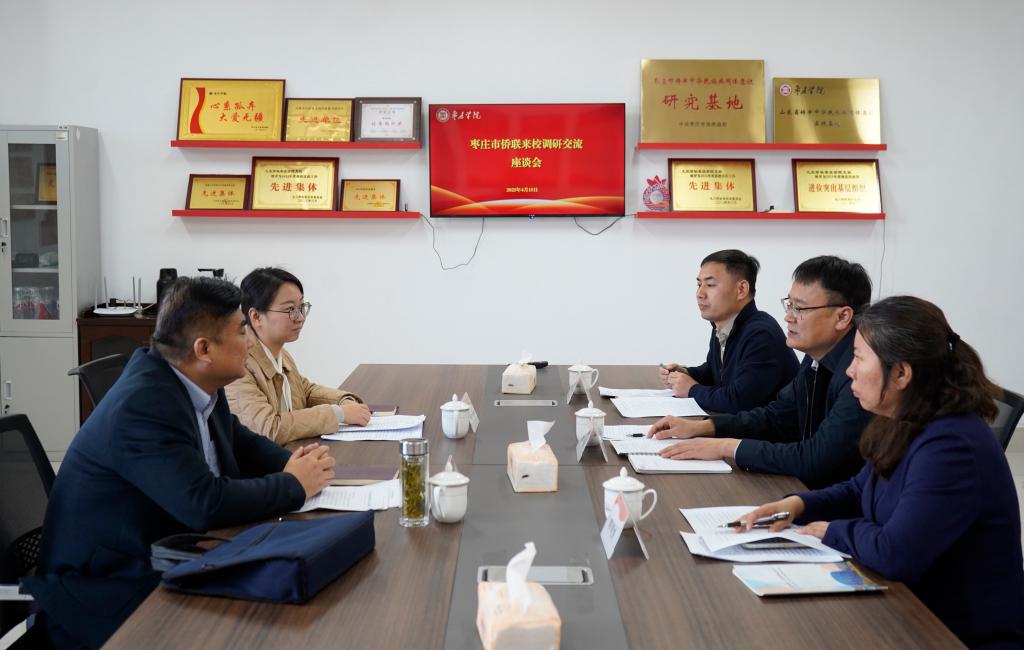 4月15日,枣庄市侨联党组成员、副主席满清义带队来校调研交流高校侨联建设工作。校党委委员、统战部部长林勇,外国语学院(大学英语教学部)院长、欧美同学会会长韩建侠与满清义一行举行座谈。