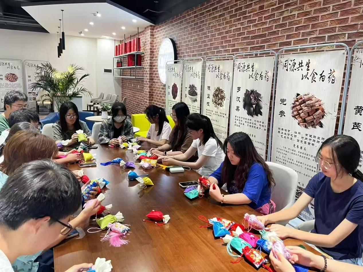 活动现场,学院专业教师带领同学们辨识艾叶、薄荷、陈皮、丁香等中药材,讲解其药理功效与配伍文化:“艾叶驱寒安神,薄荷醒脑舒缓,这些药材不仅可入药入膳,更能通过香气调节情绪。”同学们在教师指导下精心调配香料,缝制出兼具功效与美感的端午香囊。一针一线间,传统技艺的匠心与药食文化的智慧悄然流淌。