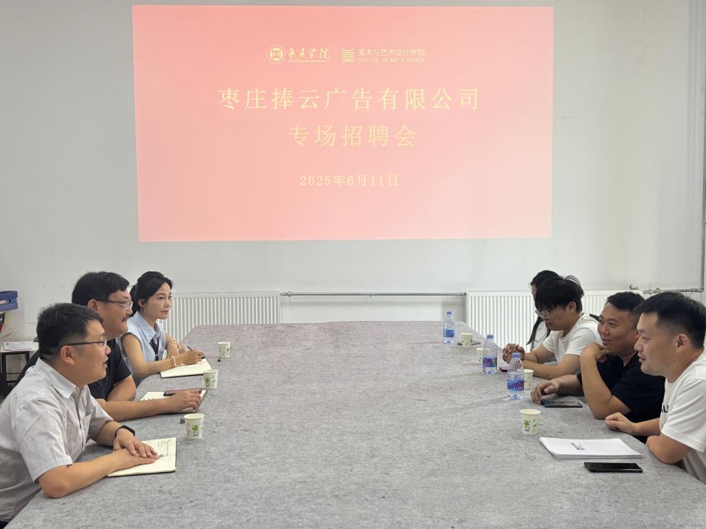 为持续推进2025届毕业生就业工作,推动人才培养与行业需求精准适配,6月11日,美术与艺术设计学院邀请枣庄市捧云广告有限公司开展专场招聘宣讲会,该公司设计总监罗飞等到场宣讲,学院党政领导、辅导员及2025届毕业生参加。