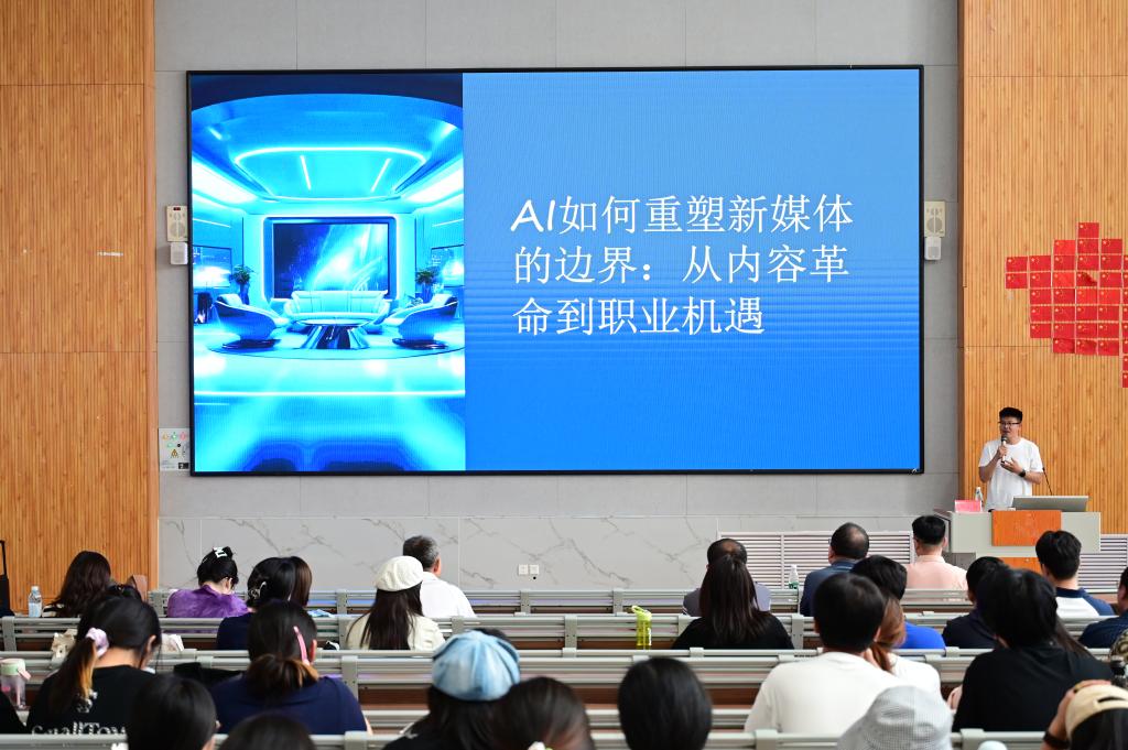 6月11日下午,文学院(传媒学院)在增信楼113报告厅举办AI技能提升专题讲座。特邀凤凰数媒(北京)科技有限公司产品研发经理刘学为担任主讲嘉宾,学院师生代表200余人参加。