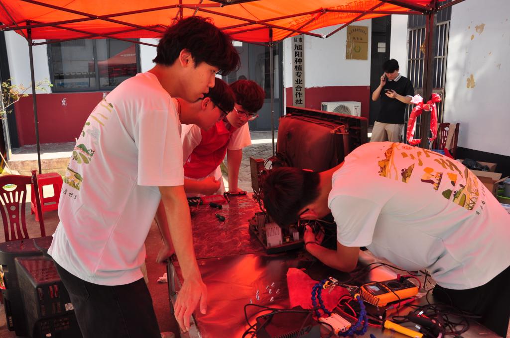 在维修家电活动现场,队员们手持螺丝刀、万用表等工具迅速开展工作,熟练拆卸电器外壳、认真检测电路参数,逐一排查故障隐患。对于能够现场修复的电器,志愿者凭借专业技术使其“重获新生”;针对无法当场维修的设备,他们耐心向居民说明损坏原因,并提供专业维修建议。