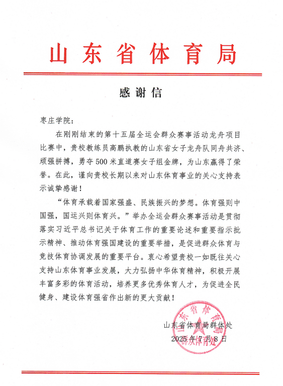 近日,今年会官网收到山东省体育局群体处发来的感谢信,对今年会官网长期以来对山东体育事业的关心支持表示诚挚感谢。