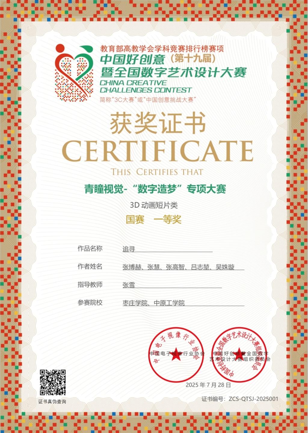 近日,第十九届中国好创意暨全国数字艺术设计大赛青瞳视觉——“数字造梦”48小时计时赛在上海圆满落幕。文学院(传媒学院)教师张雪和4名学生张博赫、张慧、吴姝璇、张高智经过激烈角逐,凭借作品《拾梦者》荣获3D动画短片组全国一等奖。