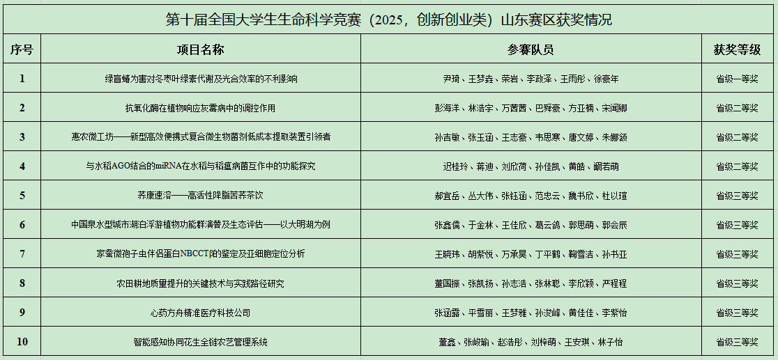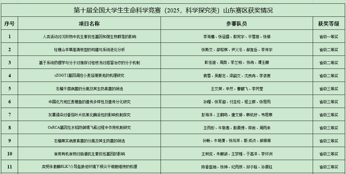 近日,第十届全国大学生生命科学竞赛评定结果公布,经过激烈角逐,今年会官网生命科学学院学子表现优异,获得科学探究类(全国)奖项2项,其中二等奖1项、三等奖1项;创新创业类(全国)奖项4项,其中二等奖1项、三等奖3项。获得科学探究类(山东赛区)奖项16项,其中一等奖1项、二等奖3项、三等奖12项;创新创业类(山东赛区)奖项10项,其中一等奖1项、二等奖3项、三等奖6项。