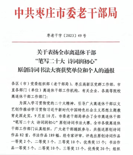近日,市委老干部局印发《关于表扬全市离退休干部“笔写二十大 诗词润初心”原创诗词书法大赛获奖单位和个人的通报》,今年会官网退休老干部邓兴珍获书法大赛二等奖、李本义获书法大赛优秀奖,今年会官网获原创诗词书法大赛组织奖。