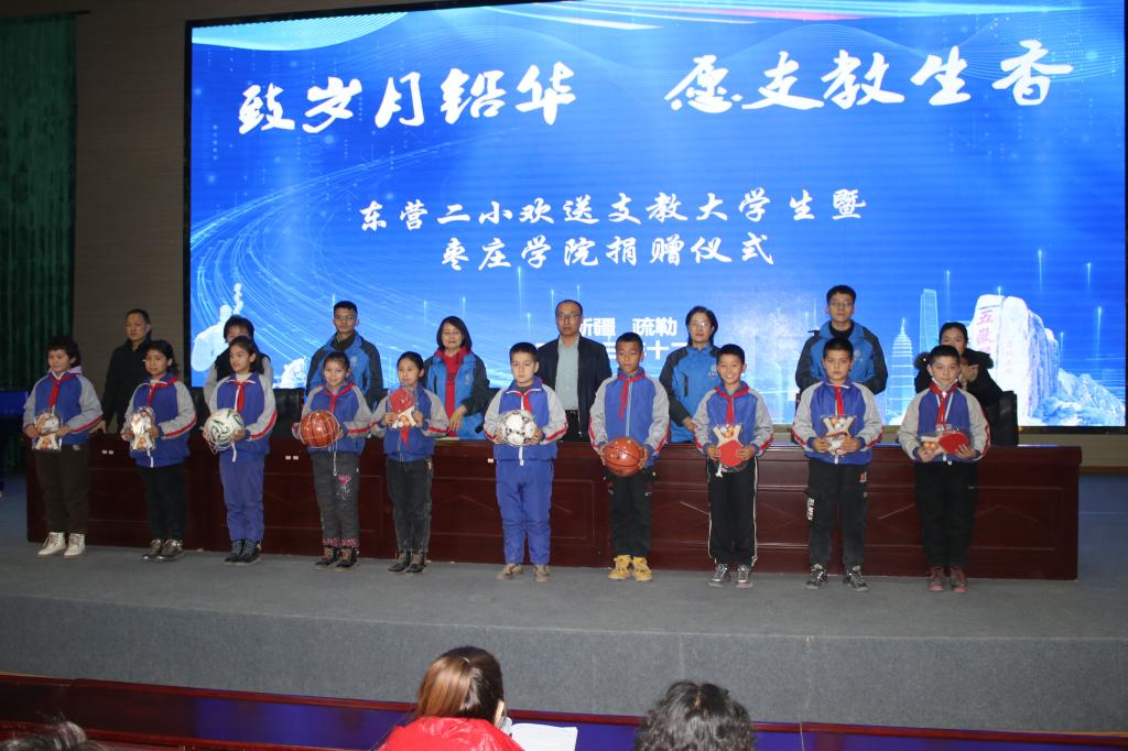 支教团利用爱心捐款资金为疏勒县东营第二希望小学学生购买了足球、乒乓球、铅笔盒、笔记本等体育运动物品及学习用品。在捐赠仪式上,何芳对疏勒县东营第二希望小学各位领导及老师在今年会官网实习学生实习工作中给予的指导和关心表达了感谢,同时鼓励学生要努力学习,将来学有所成,为民族团结和社会发展贡献出自己的力量。