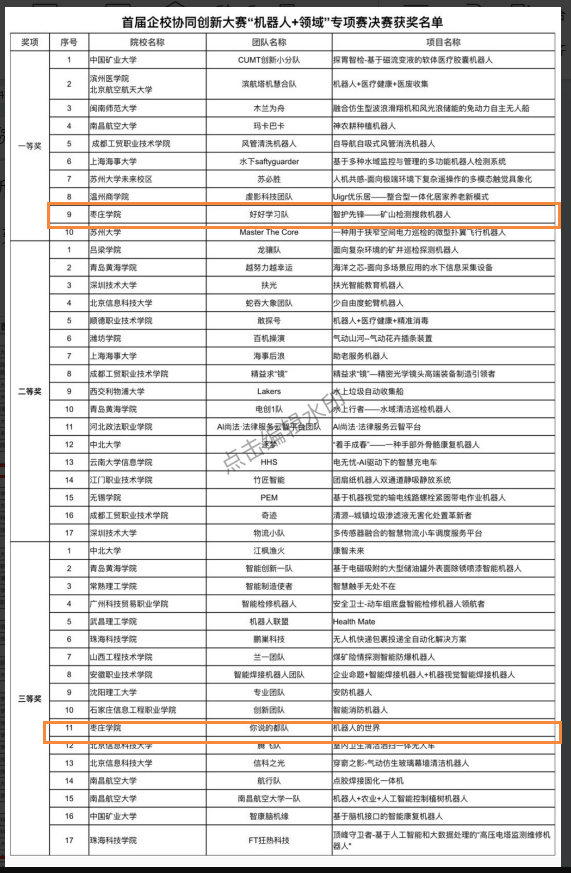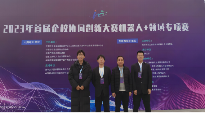 2023首届企校协同创新大赛由中国中小企业发展促进中心(工业和信息化部中小企业发展促进中心)、中国中小企业国际合作协会联合中国产学研合作促进会、全国工商联人才交流服务中心、中国教育发展战略学会产教融合专业委员会等共同主办,大赛以高校与企业协同创新攻关为主要模式,大力促进企业创新需求与高校成果研发转化深度融合。“机器人+”领域专项赛作为大赛的六大领域之一,吸引了100多所高校、400多支队伍参与。机电工程学院与合作企业共同组建指导教师团队,在学院缑亚楠、吕庆海、陈晓菲老师的精心组织下,指导学生综合运用所学专业知识和技术备赛,最终2只队伍成功入围决赛。林雪静团队荣获“一等奖”,王傲洋团队荣获“三等奖”。