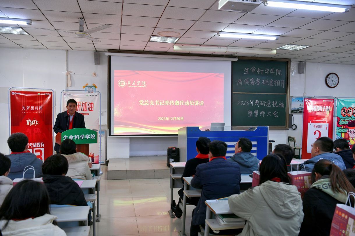党总支书记郭传鑫作动员讲话,鼓励同学们要像前辈师哥师姐一样仰望星空,脚踏实地,努力拼搏,成为服务祖国、造福社会的科学家、学者、教授,预祝所有的同学都能考出让自己满意的好成绩!并对即将考研的学子提出三方面要求:一是要持之以恒,保持自信;二要敢于实践,追求成功;第三要涵养情怀,摆正心态。寄语同学们,要有“今日长缨在手、何时缚住苍龙”的一鼓作气精神、要有“不管风吹雨打、胜似闲庭信步”的从容精神、更要有“数风流人物、还看今朝”的豪迈之情。